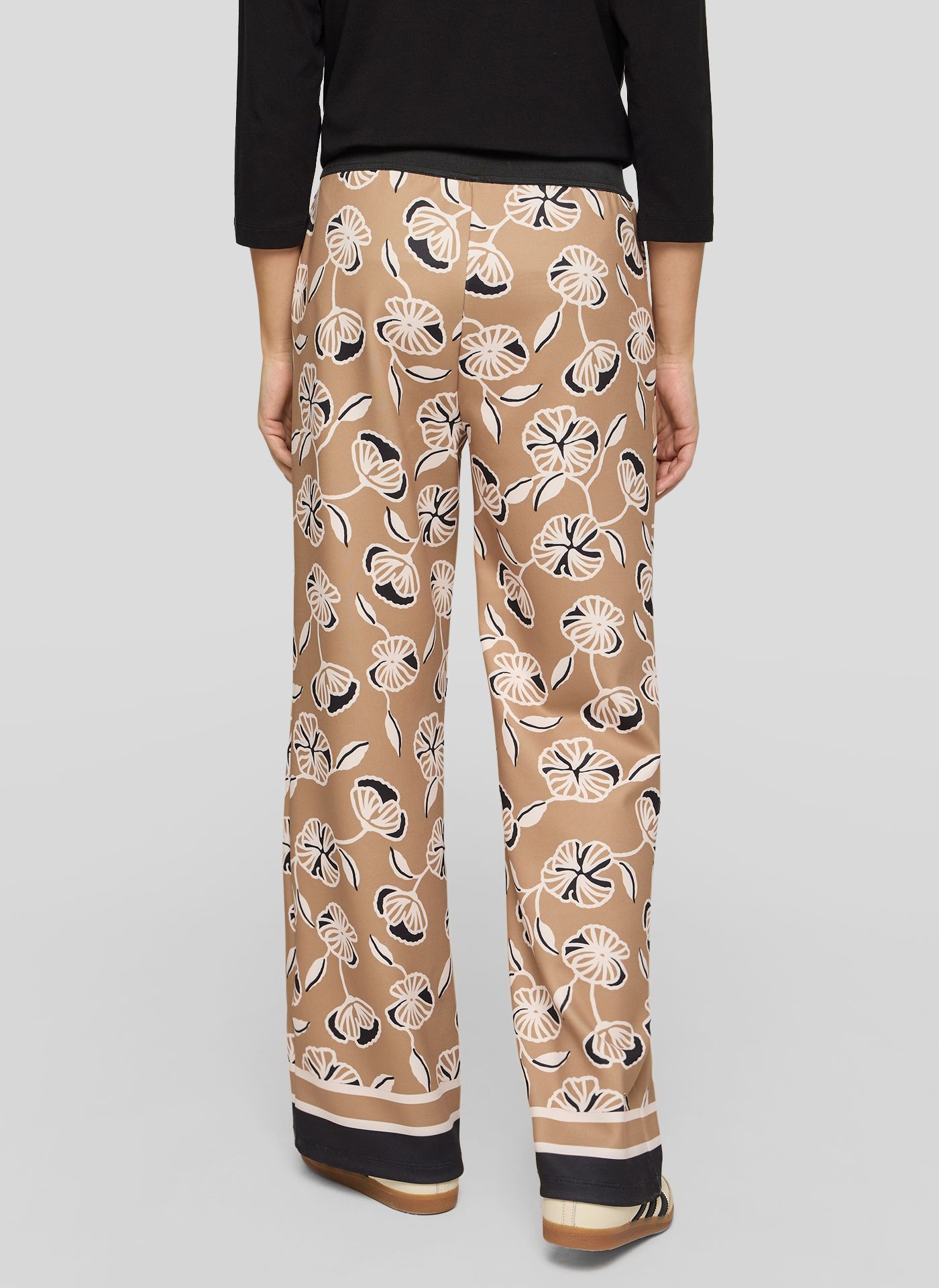 These wide-legged pull-on trousers, made from a firm fabric, offer a comfortable feel and a polished look – ideal for transitional seasons or cooler days. The elasticated waistband ensures a comfortable fit, while the all-over floral print, combined with the contrasting leg cuffs, adds a modern touch.